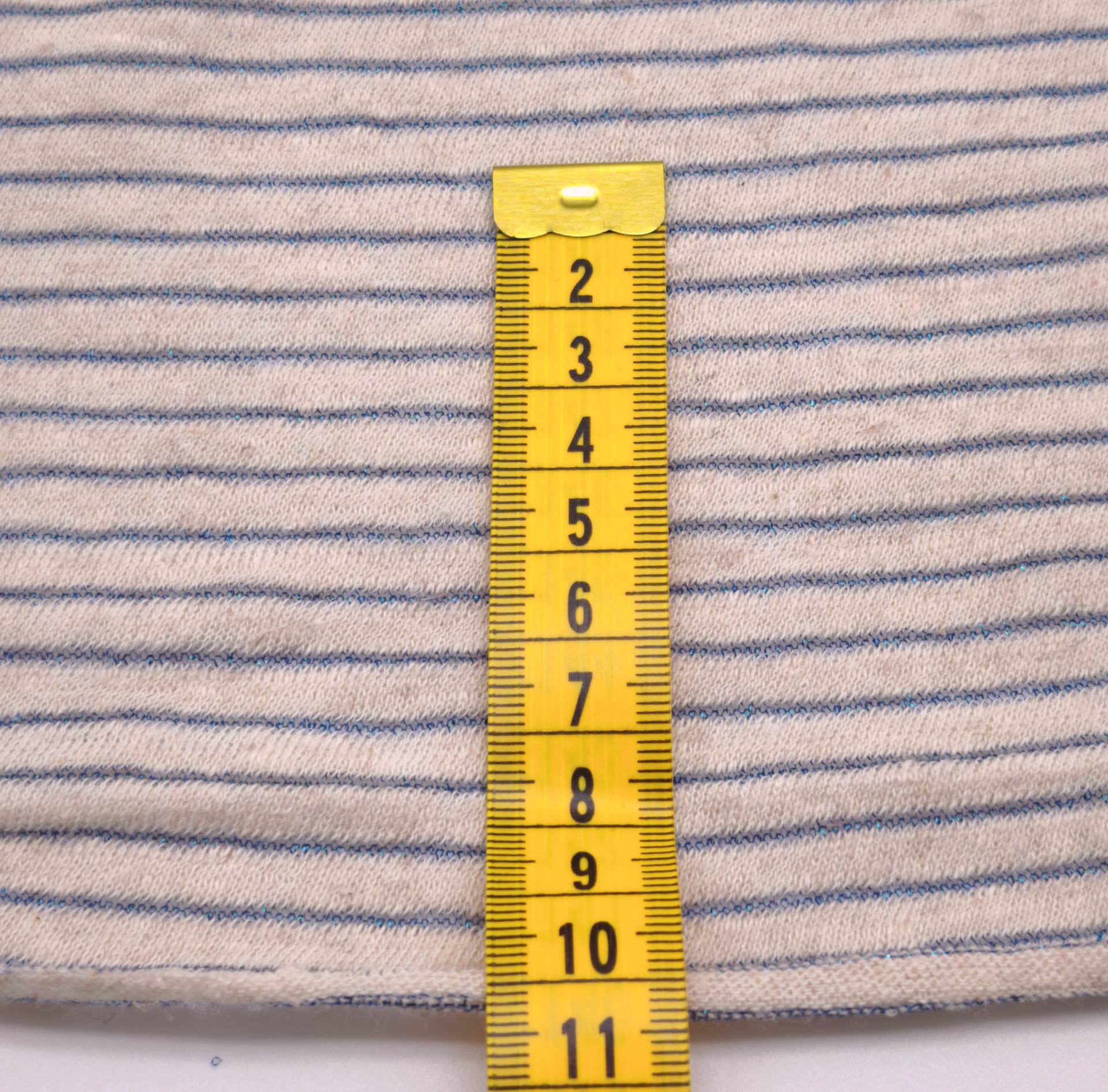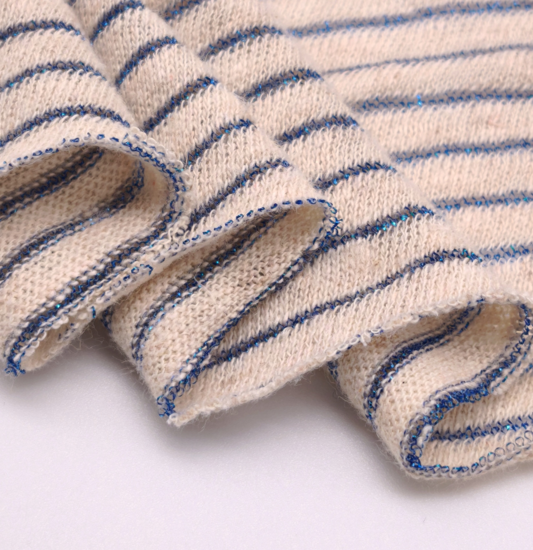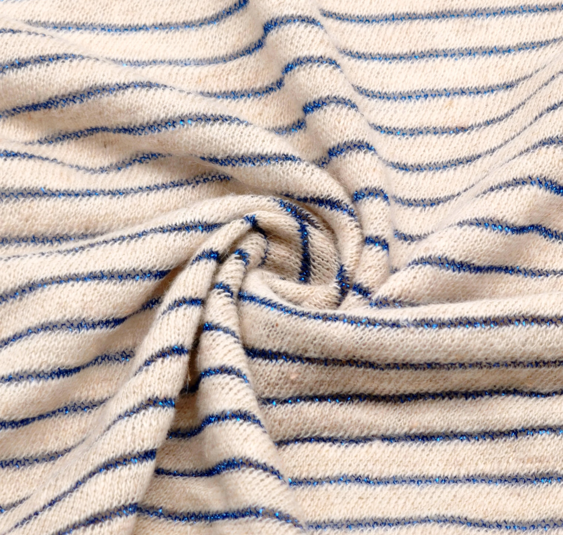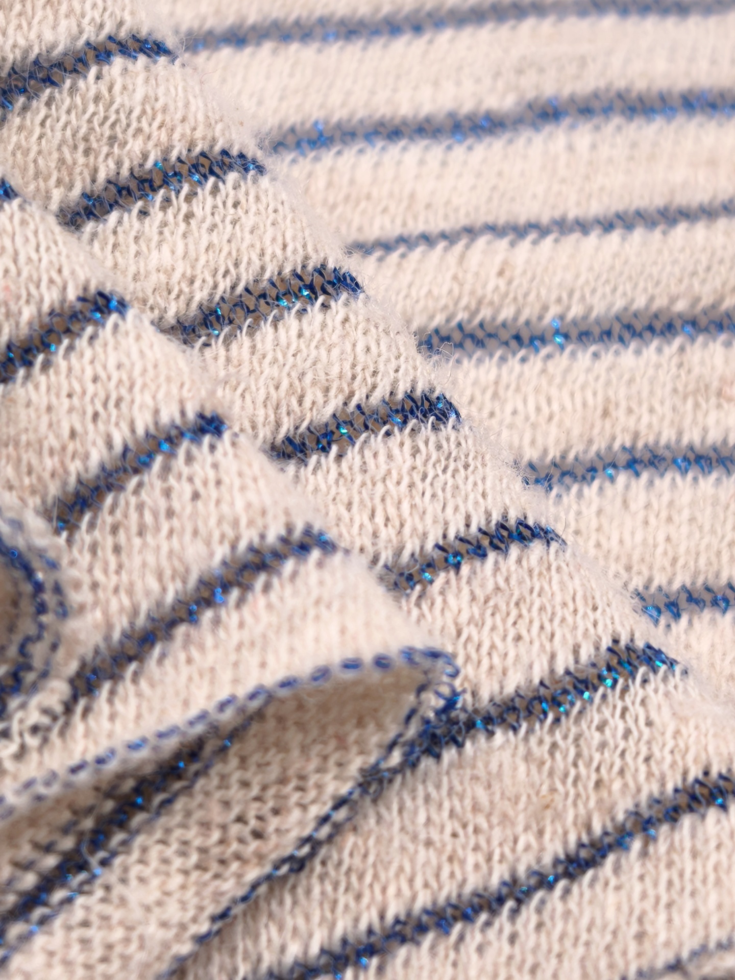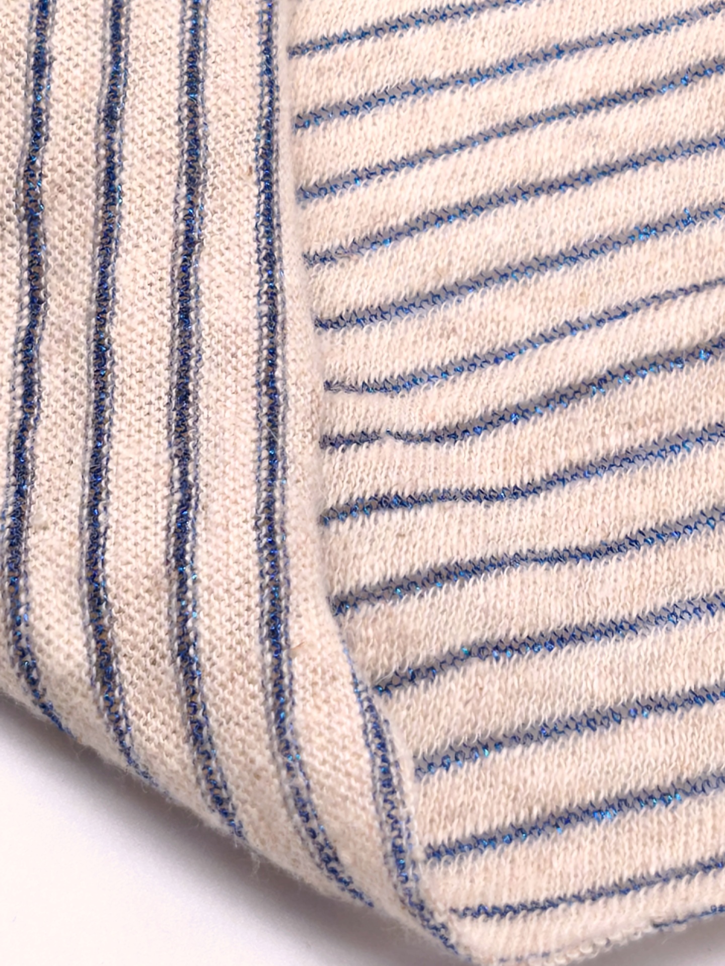 Malha em tom bege com risca azul com brilho igualmente em azul, listras ligeiramente na diagonal