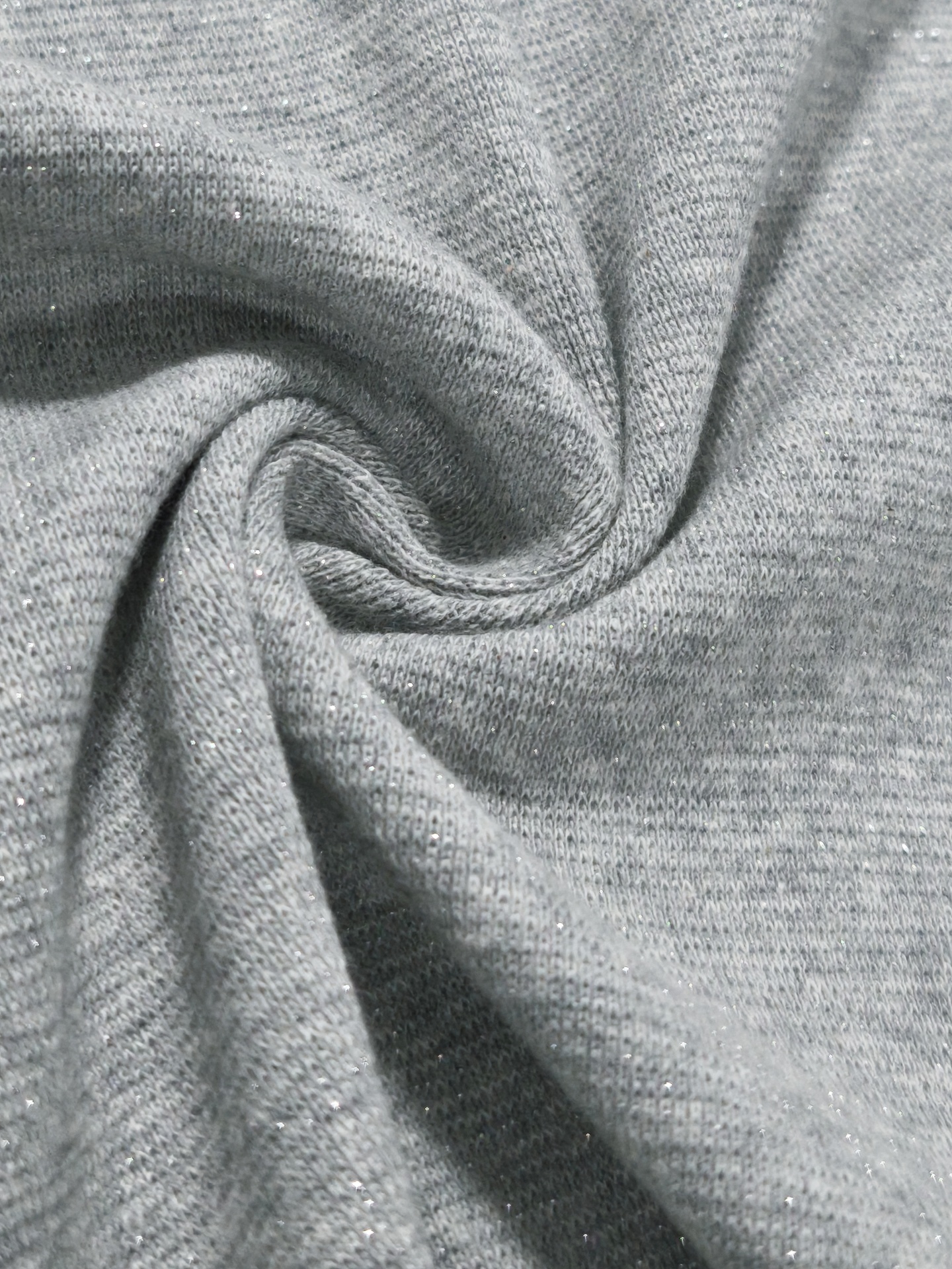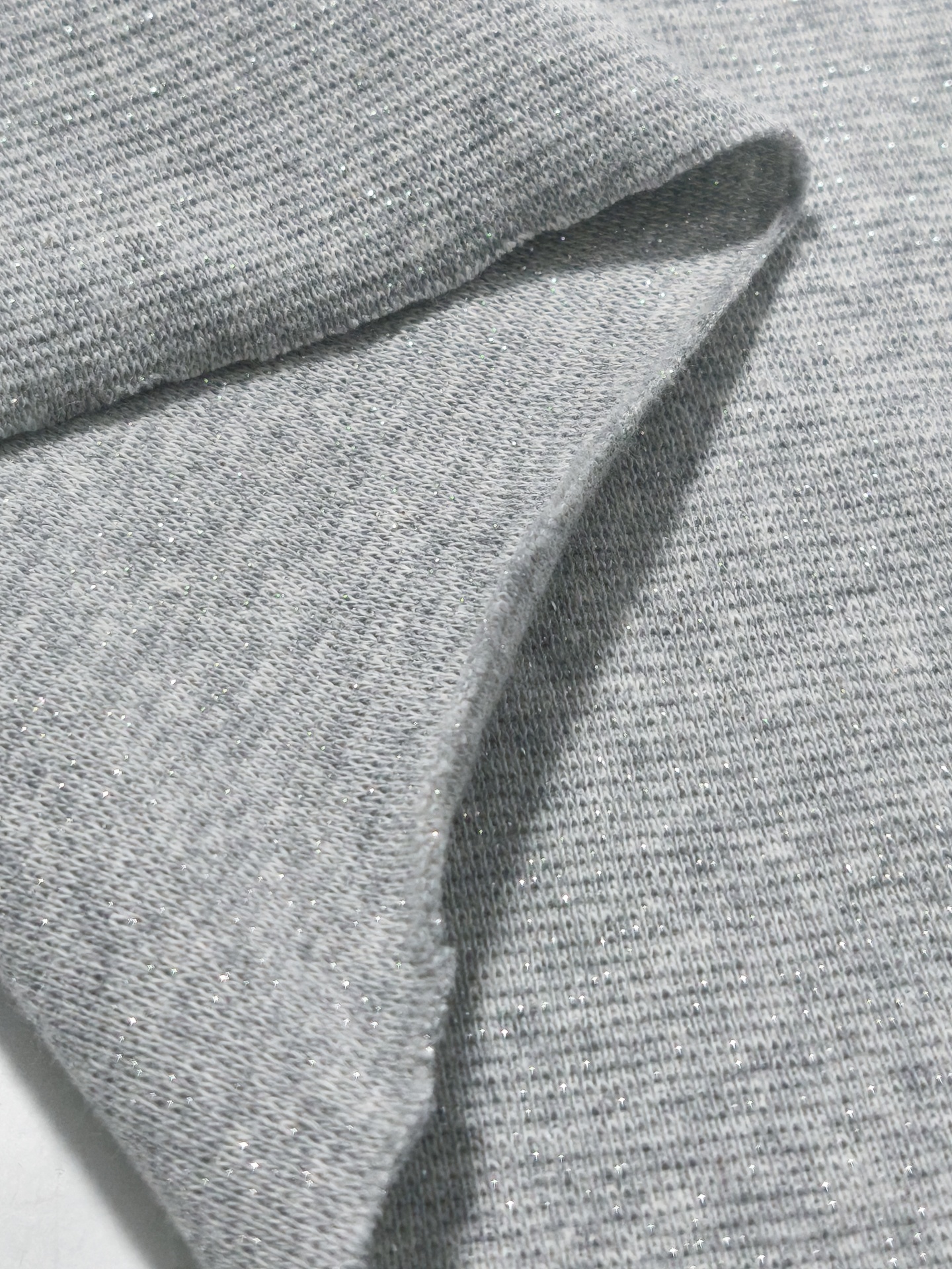 Malha em tom cinza com brilho brilho prata,macia,maleável,boa elasticidade e caimento