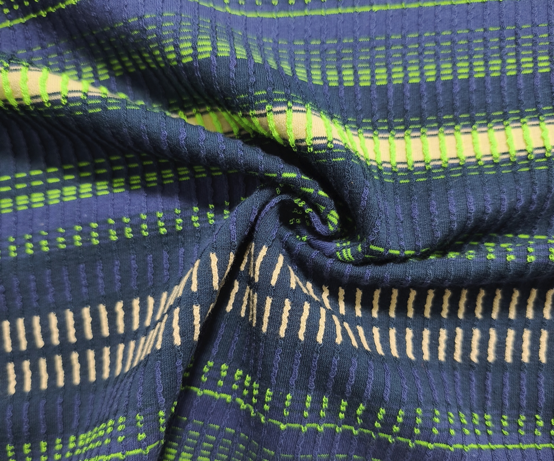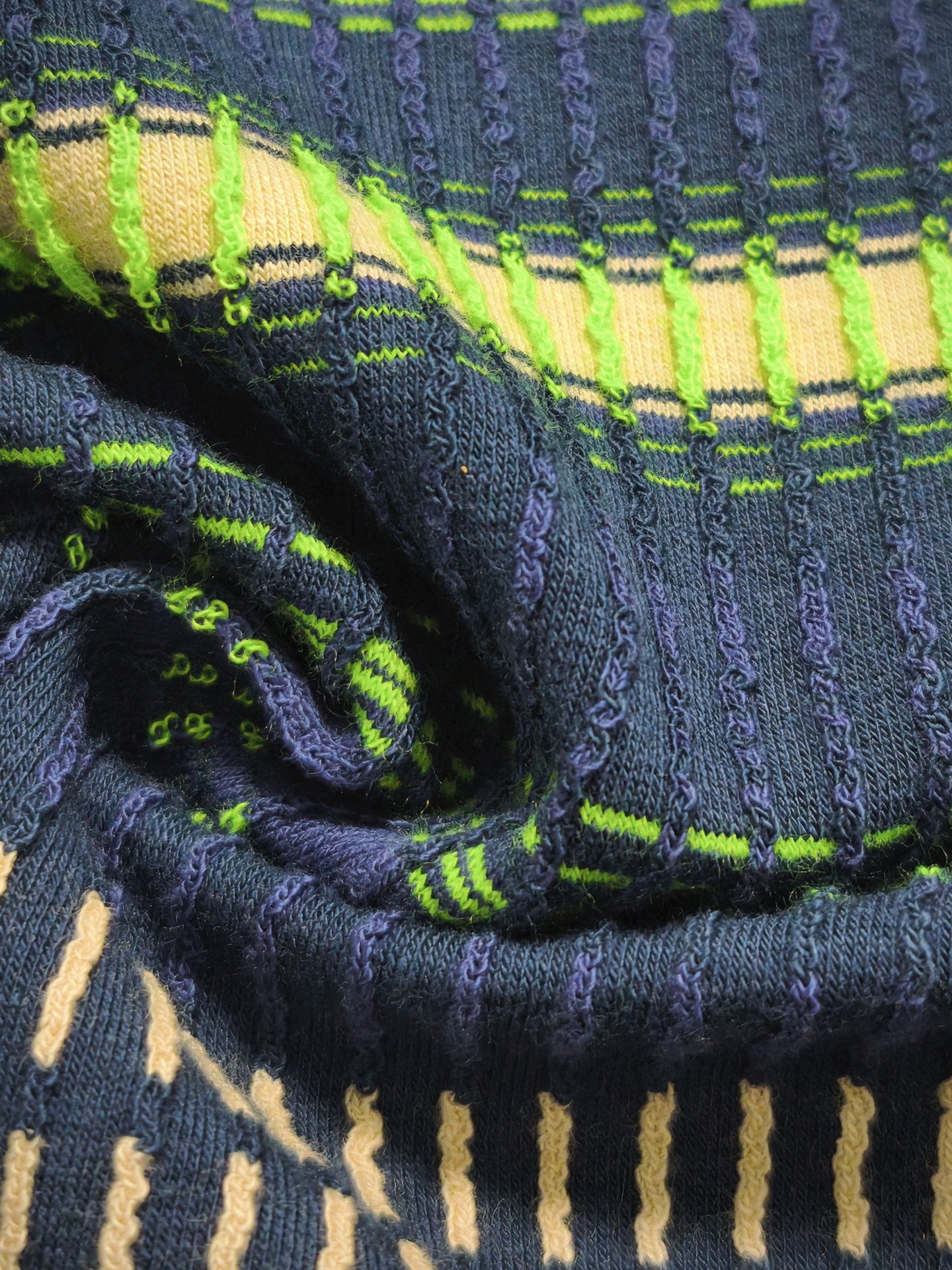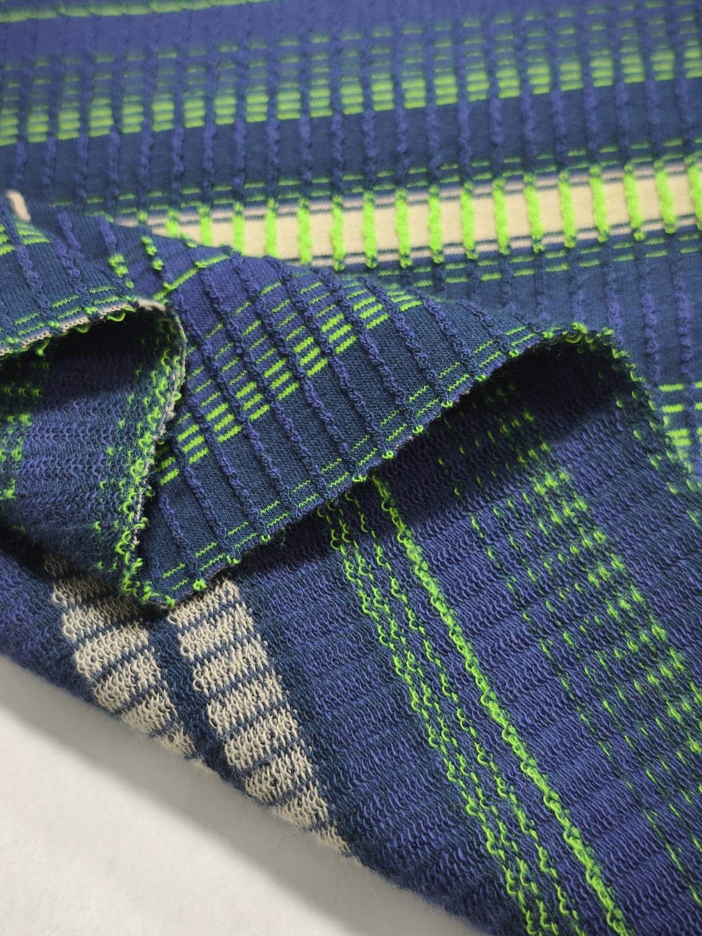 Maille côtelée relief, rayures horizontales, couleur marine, néon, beige, souple, fraîche, légèrement élastique, bonne tenue