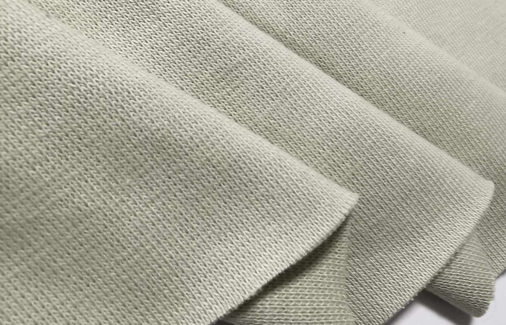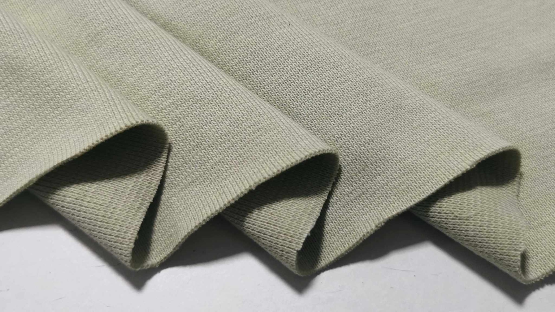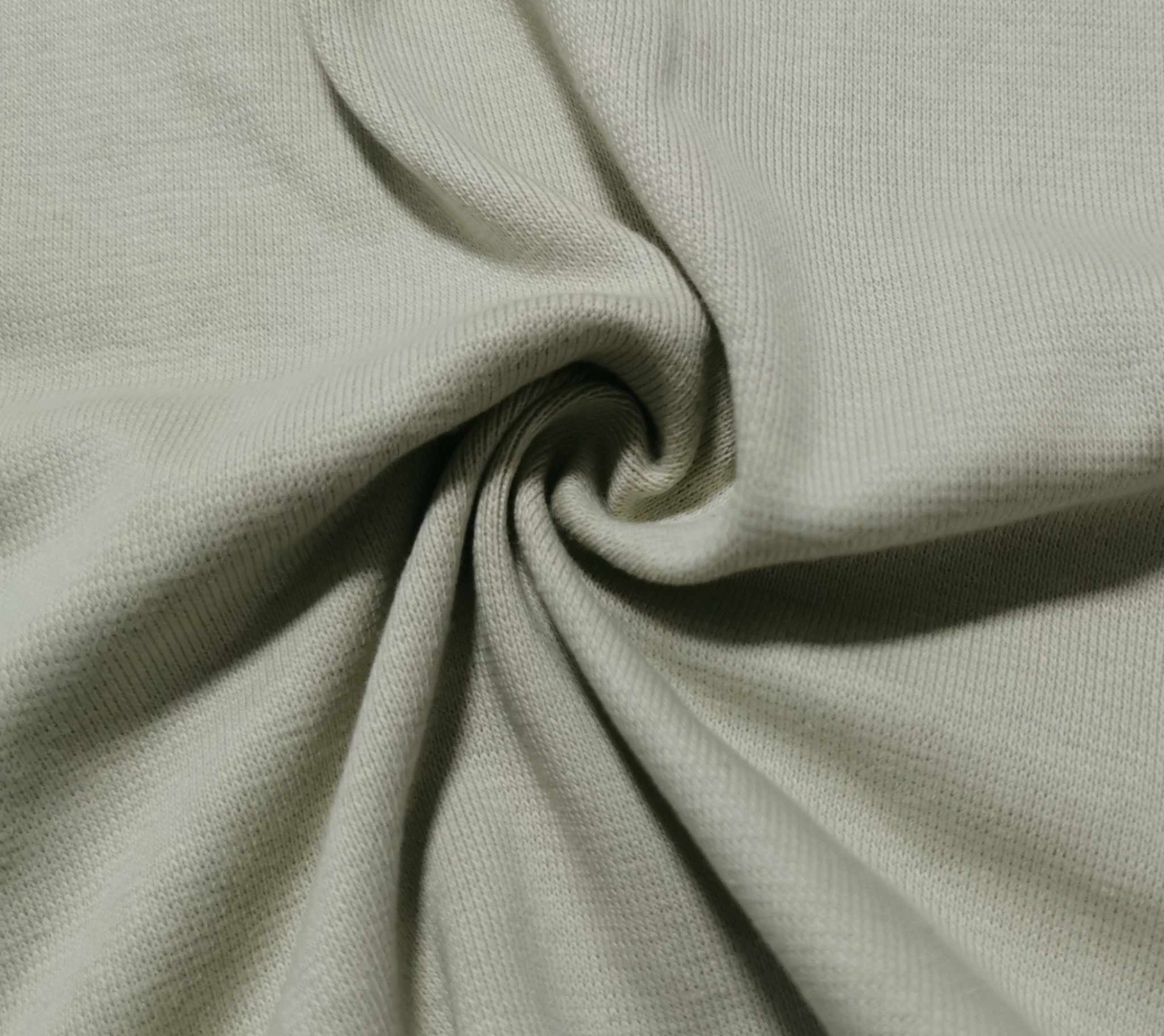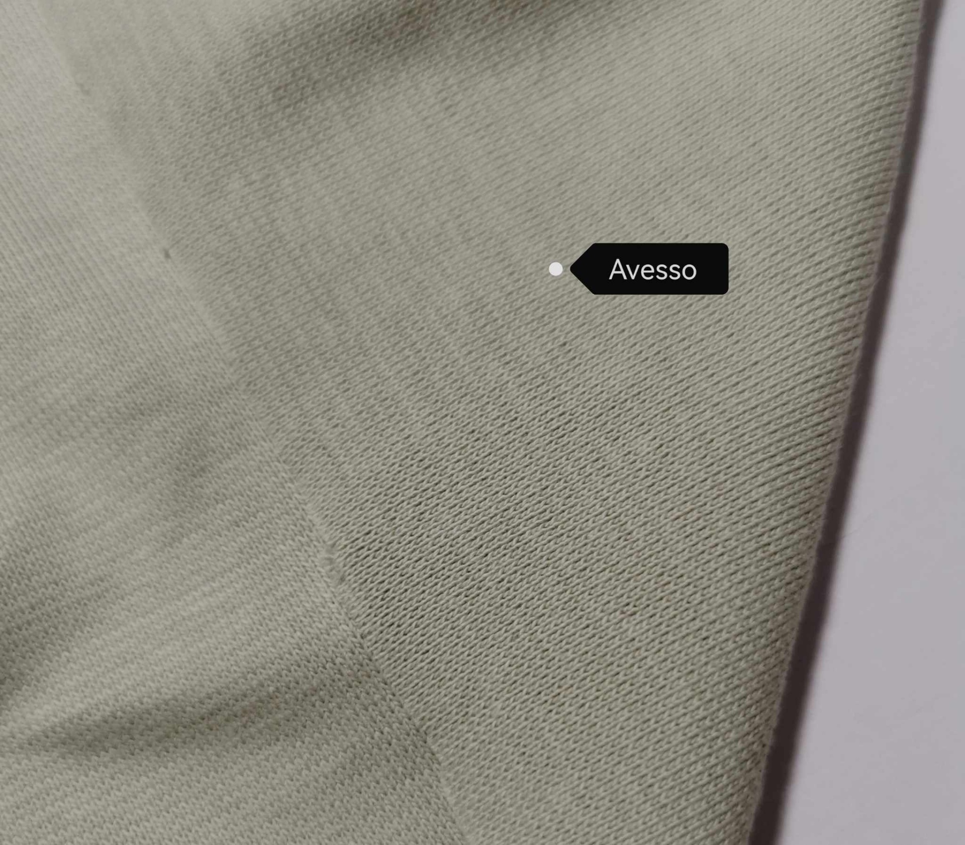 Malha de tom esverdeado claro, bastante confortável, muito boa elasticidade e toque agradável