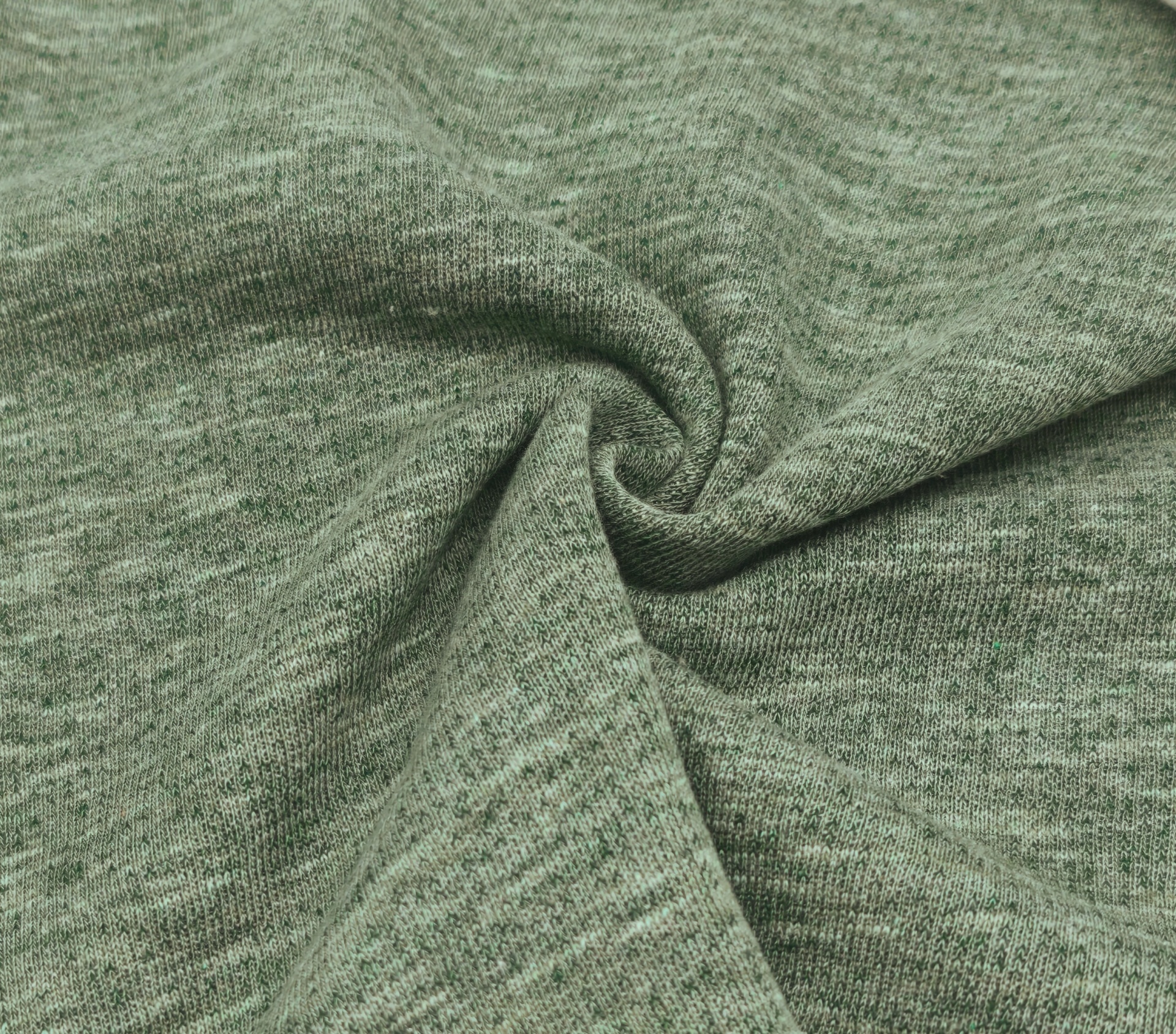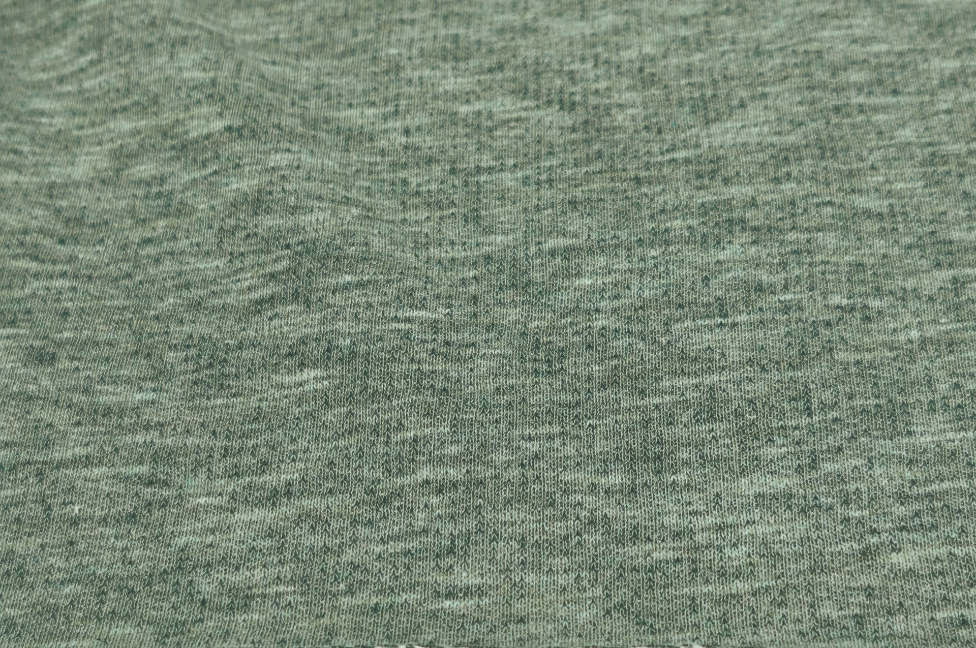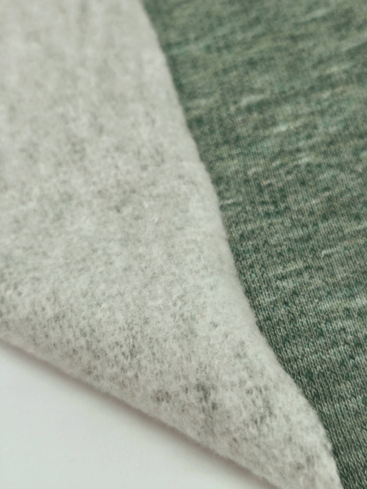 Maille mélangée verte et blanche, chaude, douce, souple, couleurs opaques, sans brillance, sans élasticité.