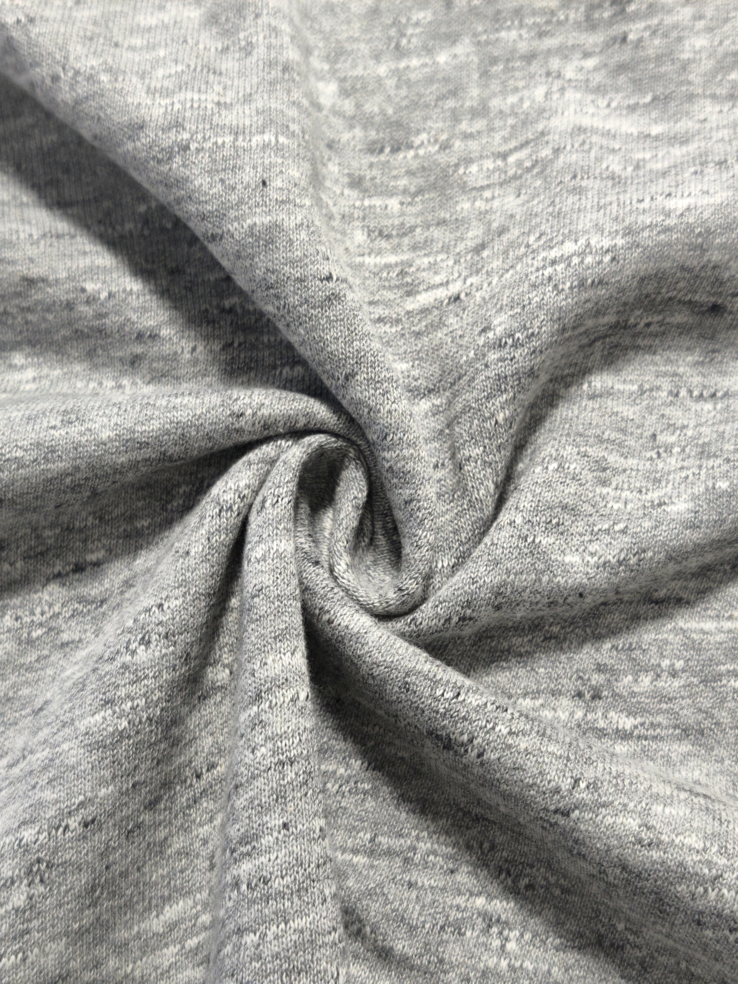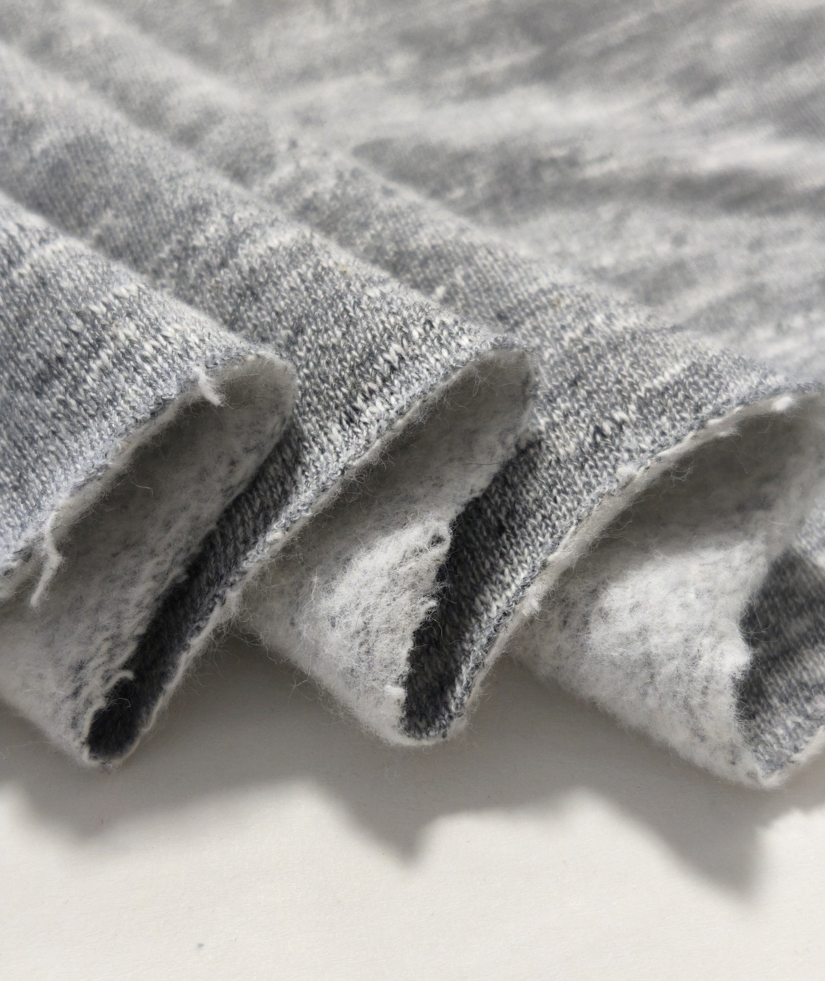 Malha com padrão ligeiramente na diagonal, quentinha, macia, maleável, cores opacas, sem brilho, sem elasticidade