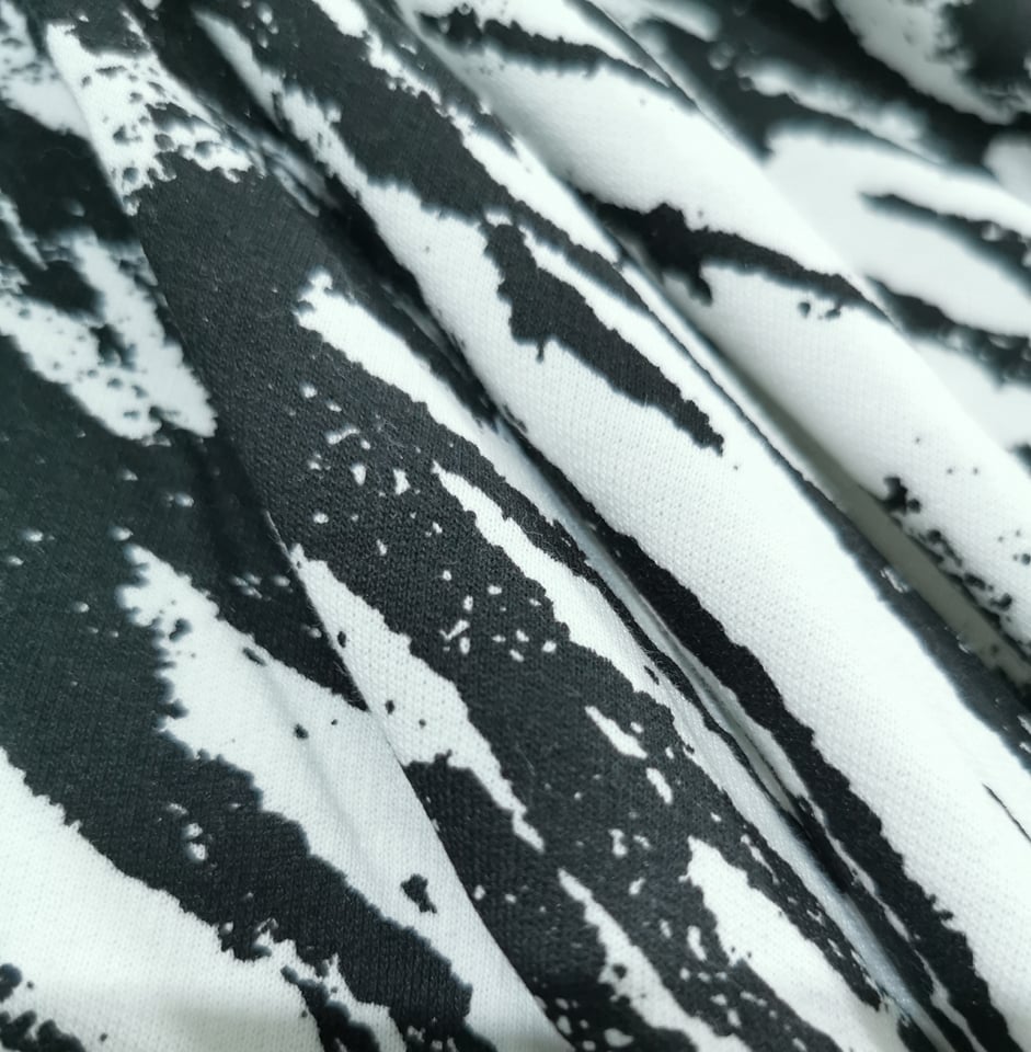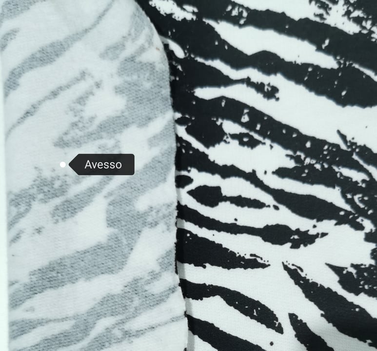 Malha com carda rasa, com estampado em tom preto,sem elasticidade, macia, maleável,