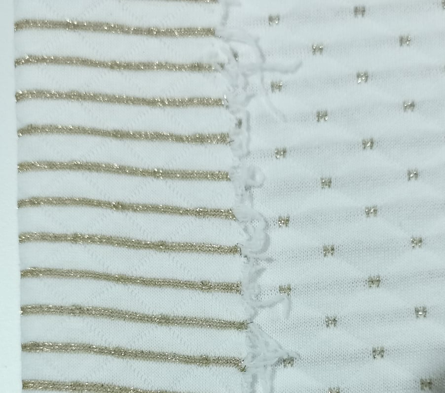 uma das faces tem fundo branco com apontamentos (pontos) em lurex a outra tem riscas finas de lurex em fundo branco