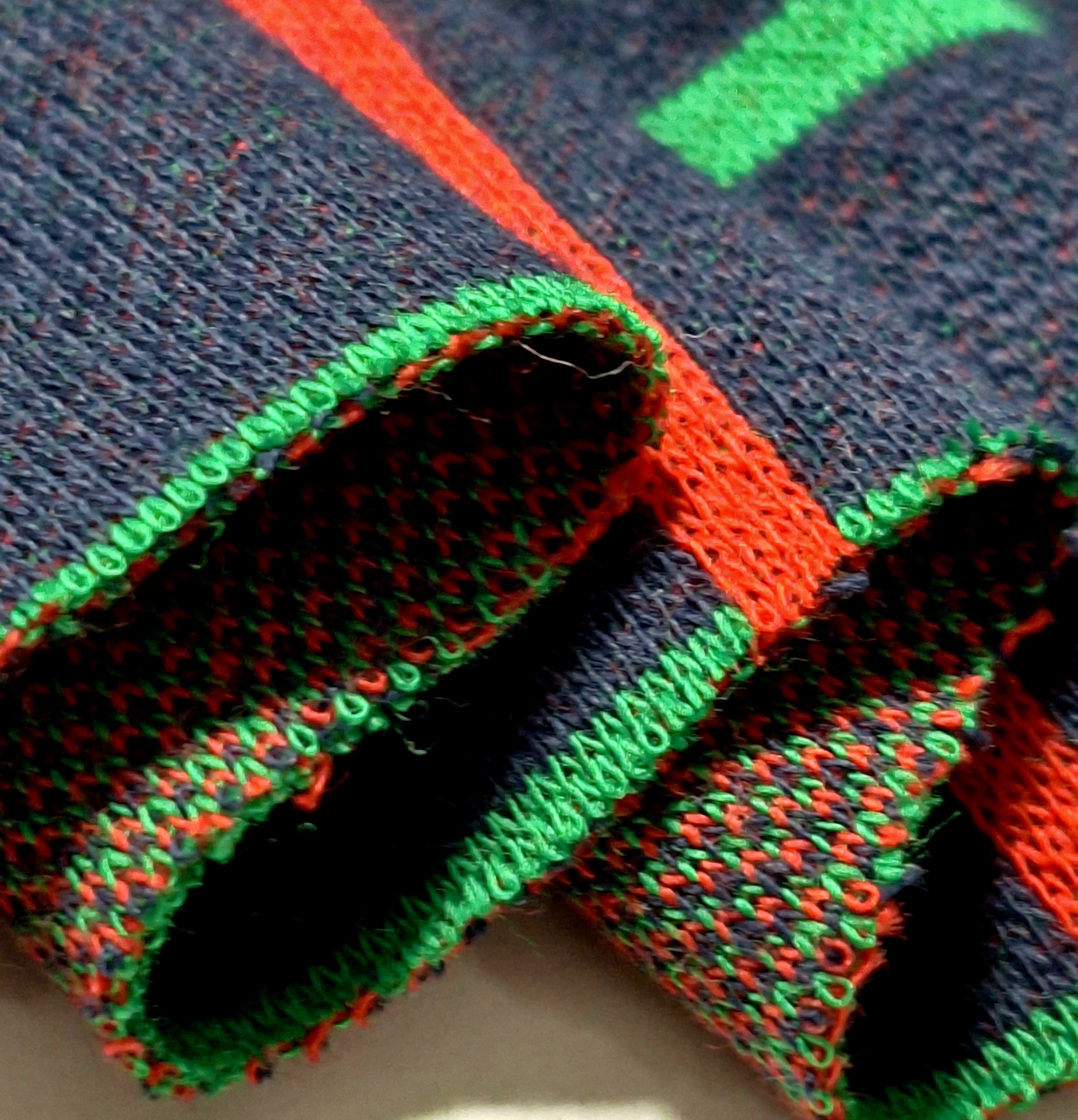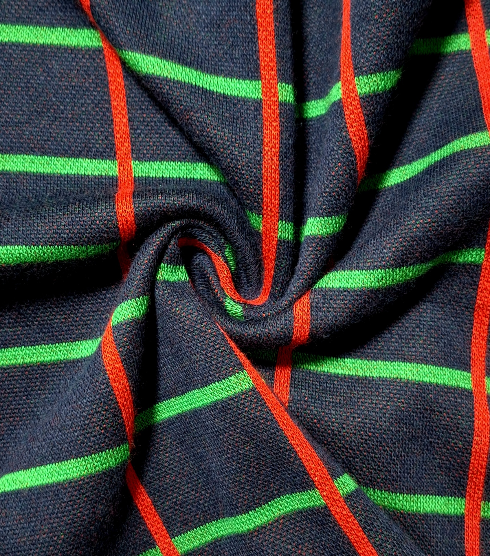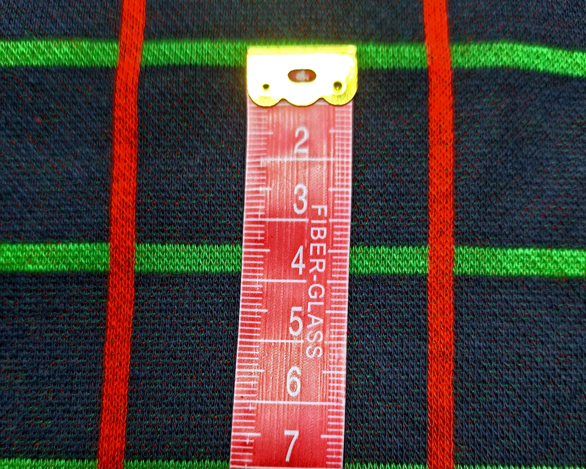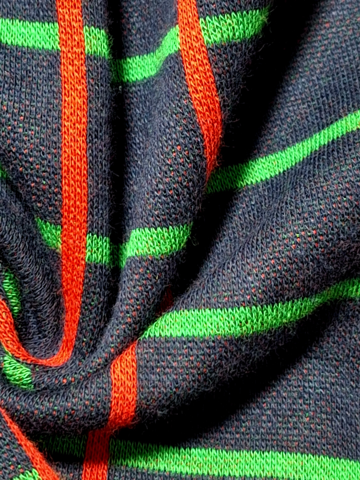 Maille jacquard interlock à carreaux, couleur de base bleu marine et rayures rouges et vertes