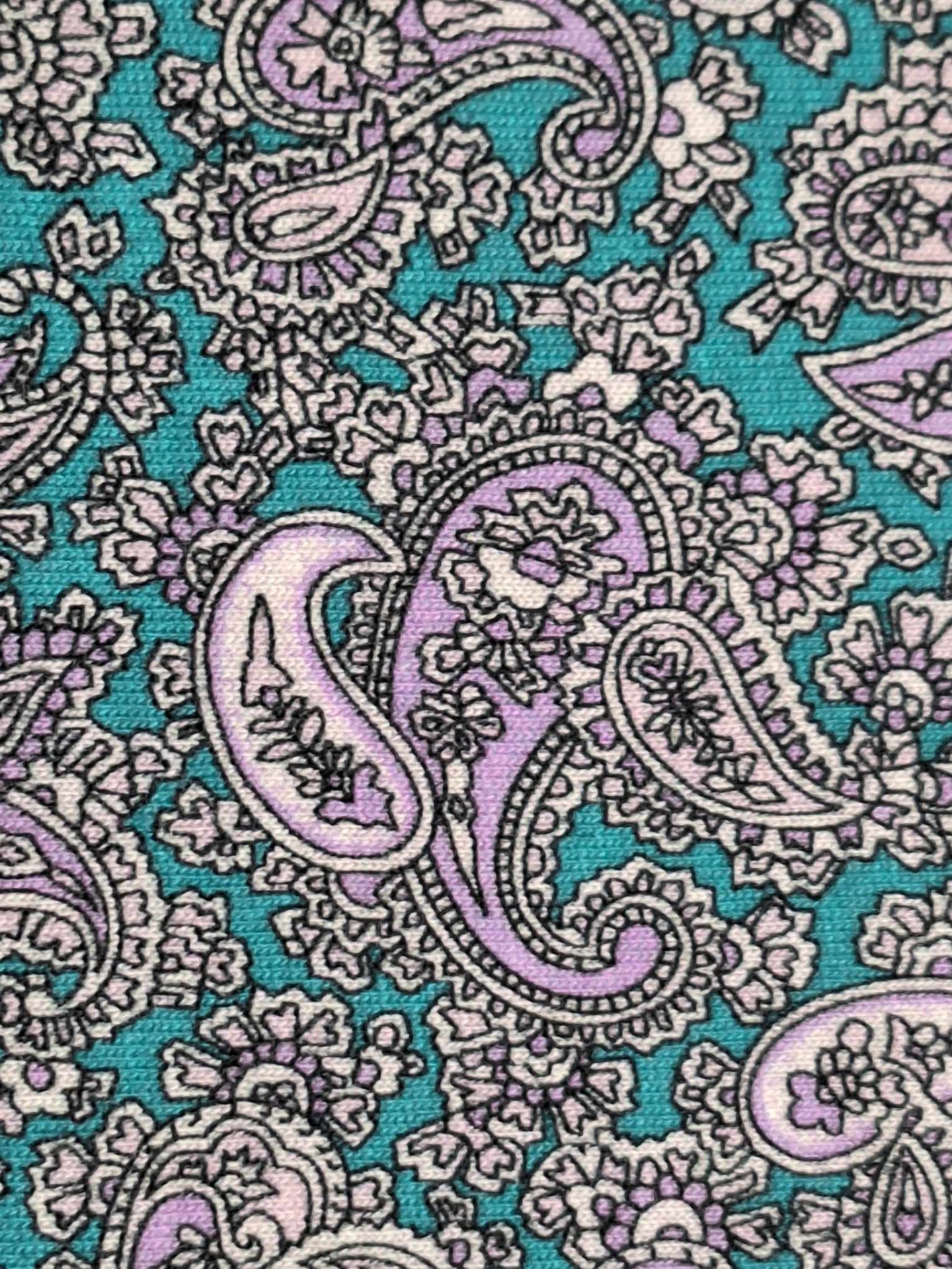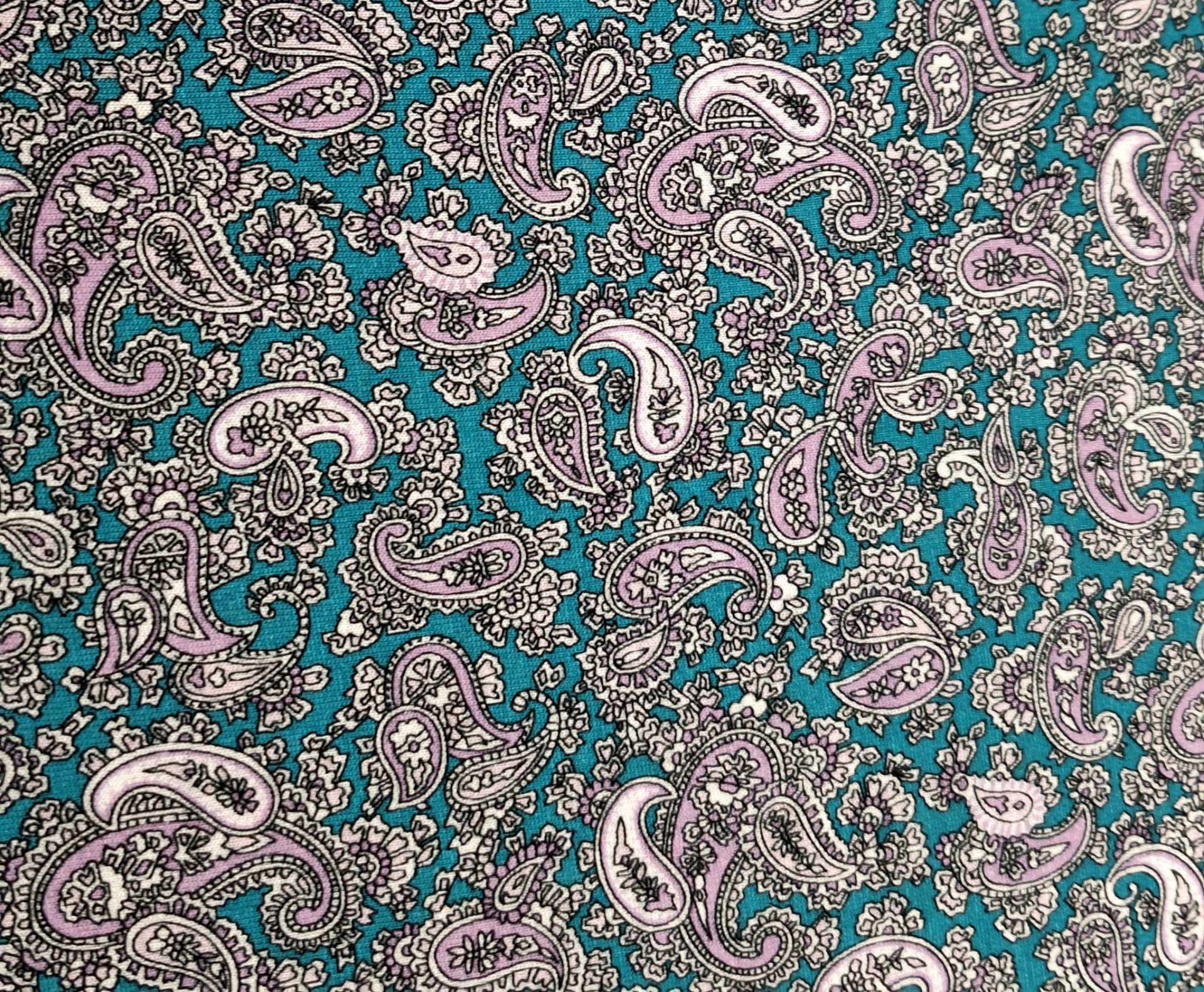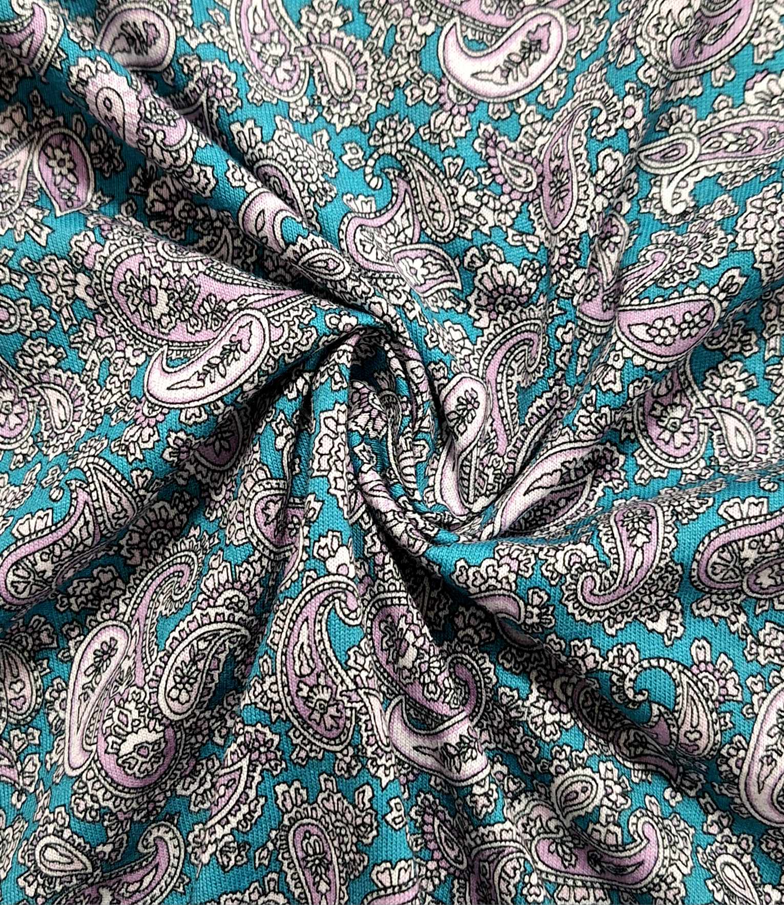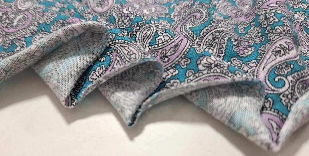 Malha fresca, sem elasticidade, estampado em tons petróleo, branco, lilás e contornos a preto