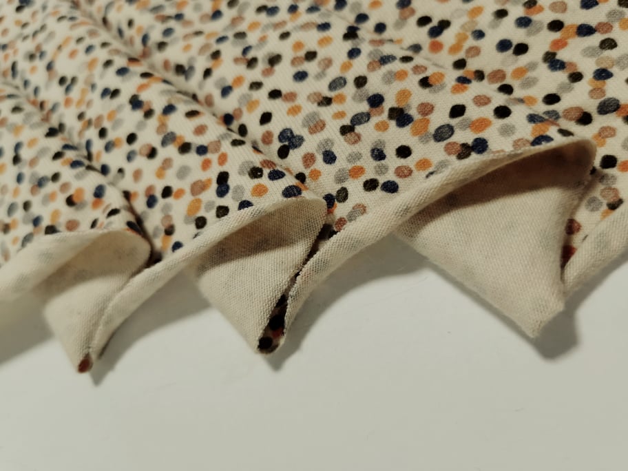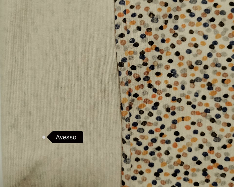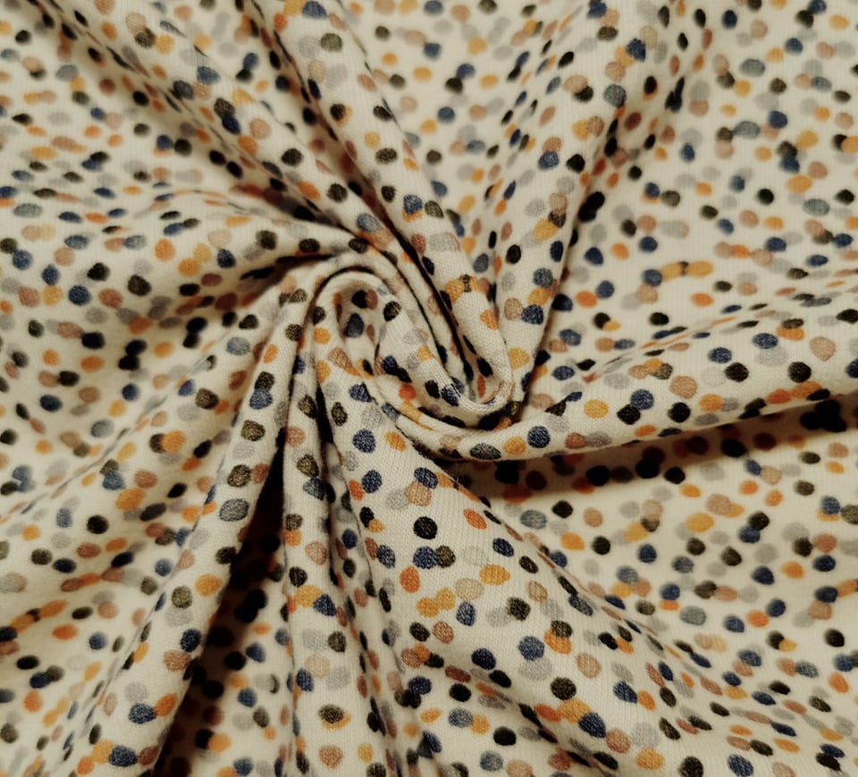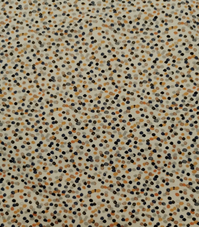 Ce tricot est très confortable, très élastique, de couleur beige avec de petits motifs circulaires aléatoires de différentes nuances.
