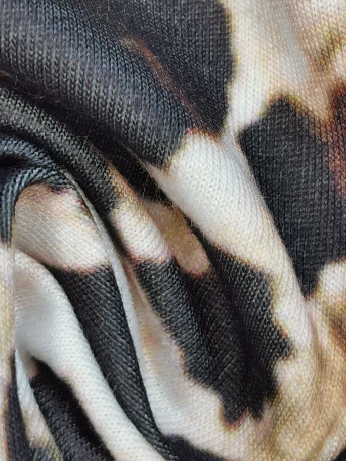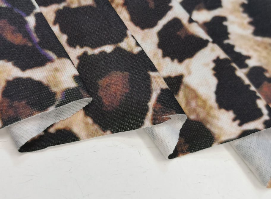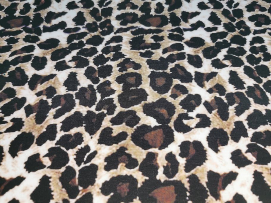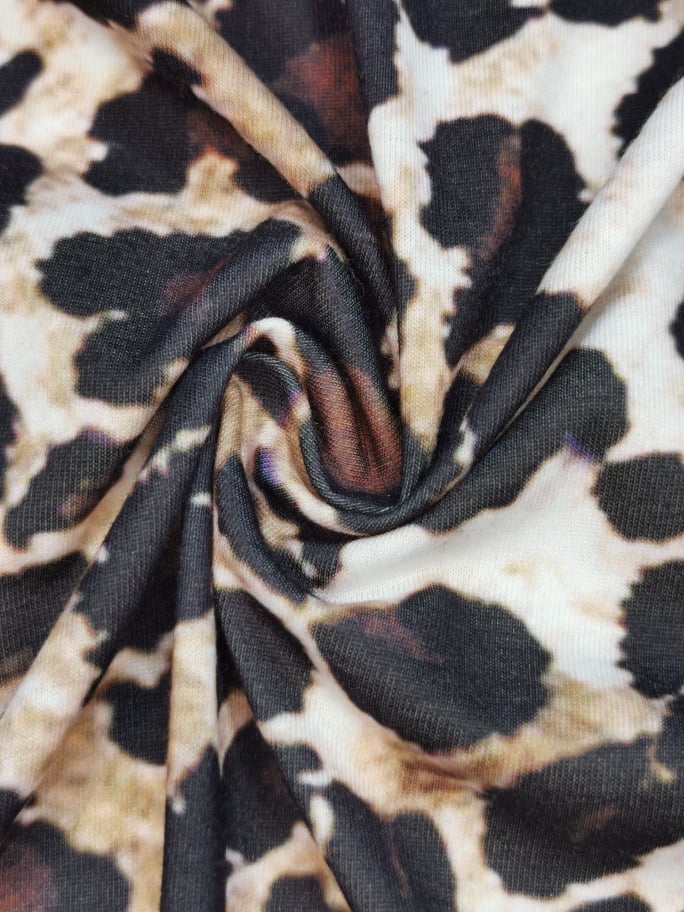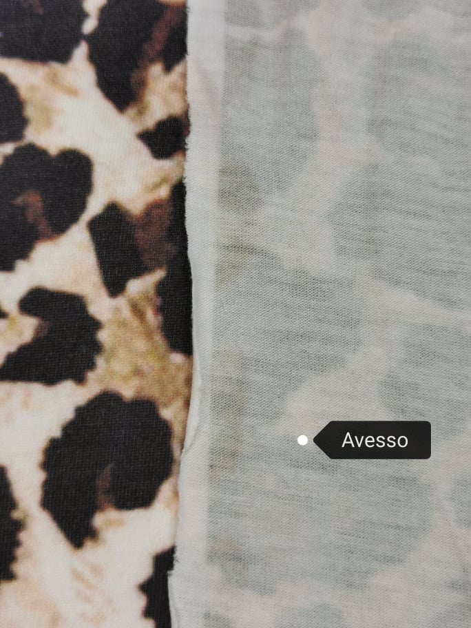 Malha com boa elasticidade , desenho sublimado em fundo branco com tons de bege/castanho e preto