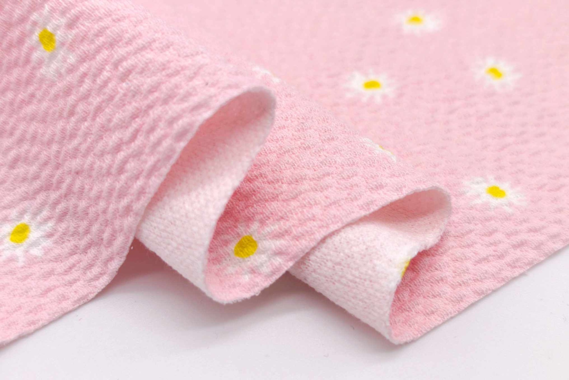 Malha com relevo, macia, maleável, fresca, com elasticidade na direção da largura