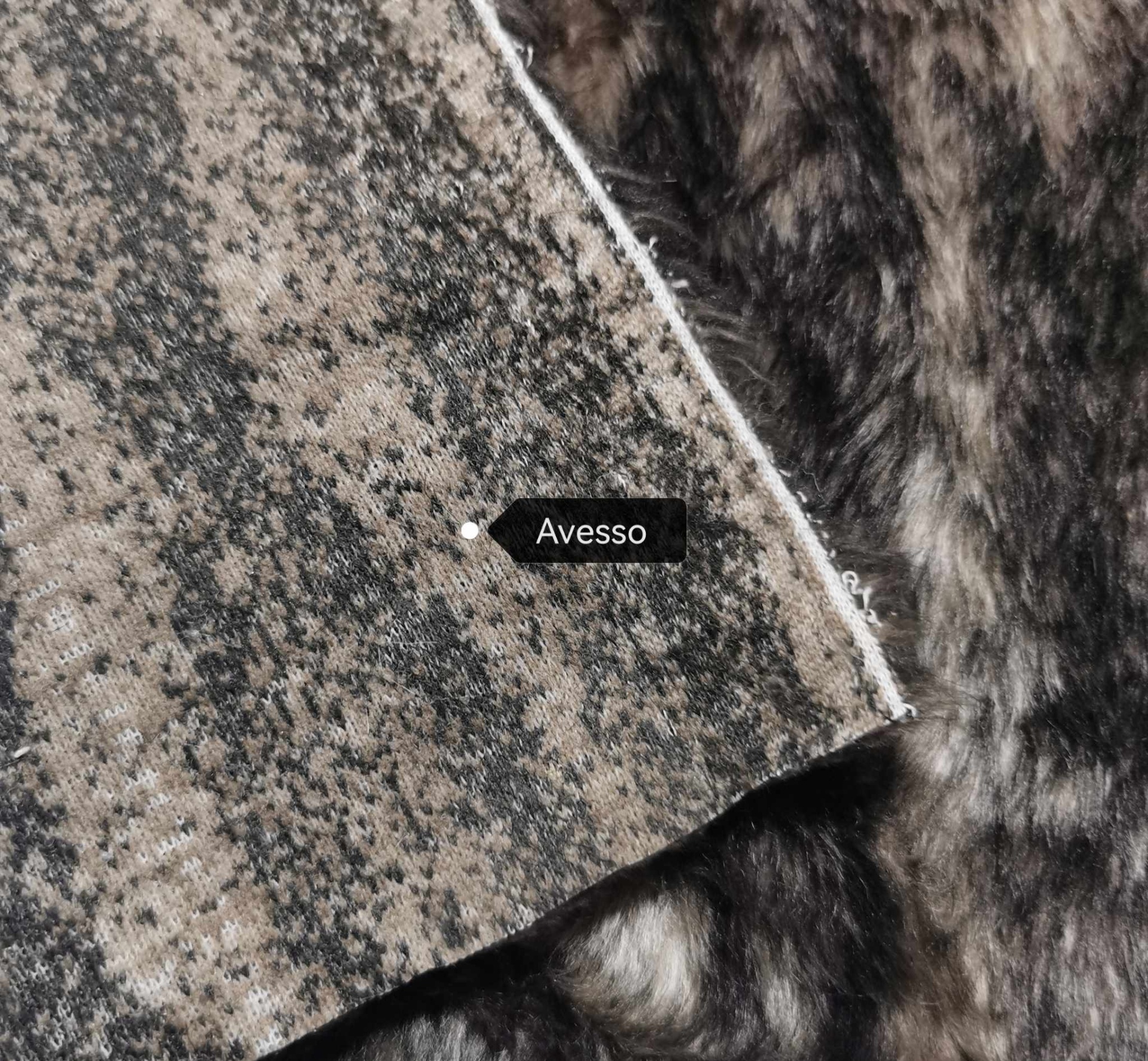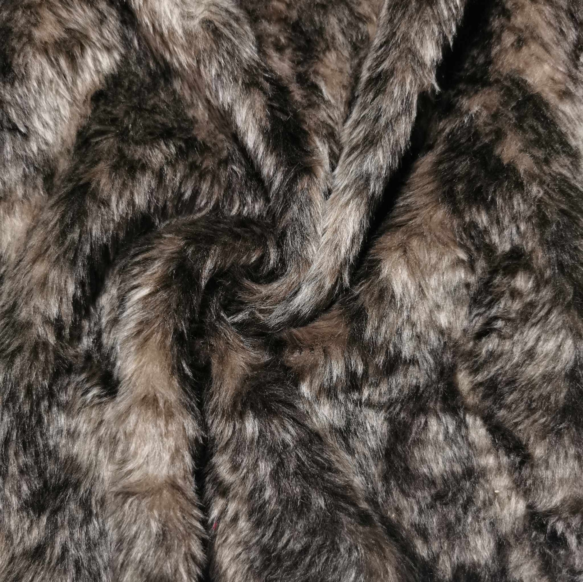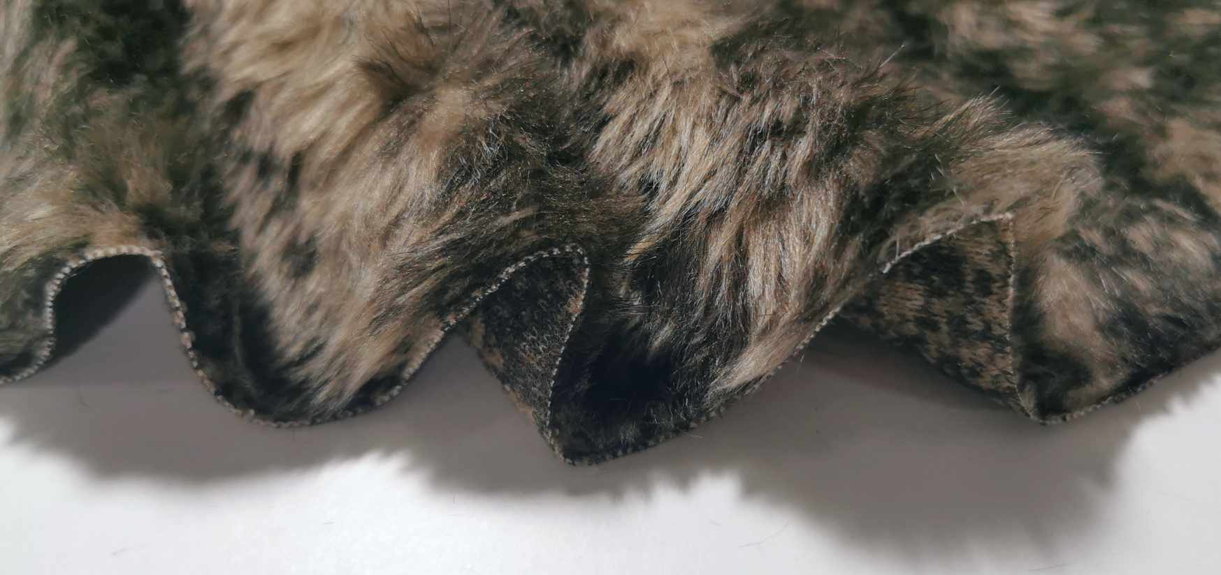 Tecido de pêlo sintético castanho acinzentado e de estampado castanho escurecido simulando o pêlo de um animal , um dos lados (avesso) é liso do outro lado (direito) tem pêlo com cerca de 1cm de altura