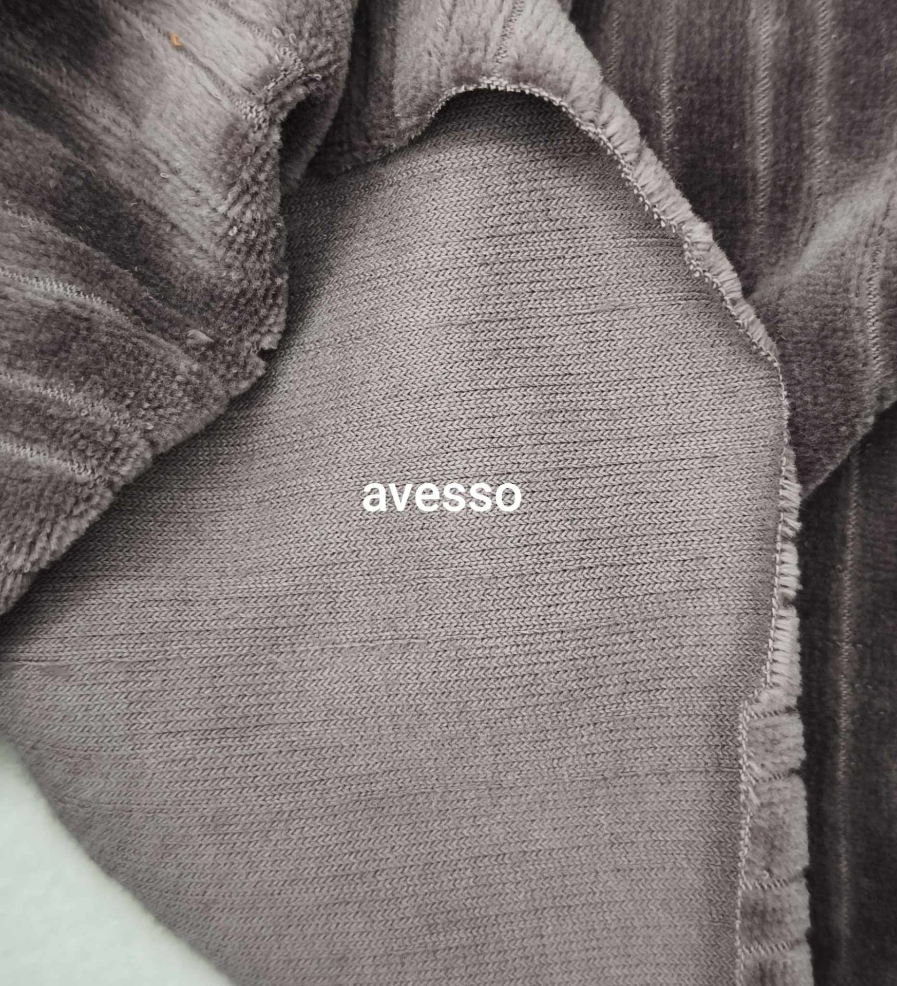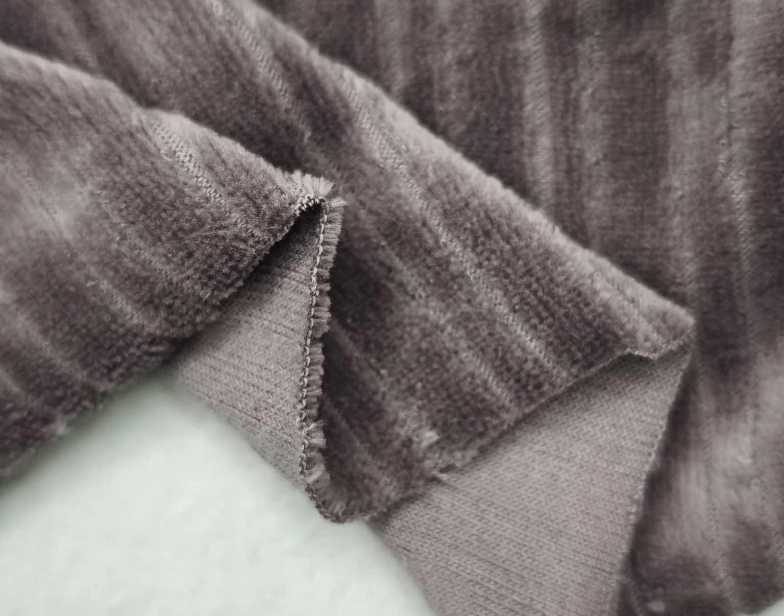 Malha toque aveludado, macia, alguma elasticidade, super confortável, canelado imitação de bombazine